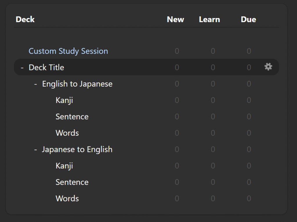 In Japanese, it’s important to understand how sentences are structured, the meanings of the words, and the meanings of the individual characters. So ideally, I would like to practice all of the above, from Japanese to English, and English to Japanese. This means building 6 decks of different cards, for just 1 song. The structure would look something like this: