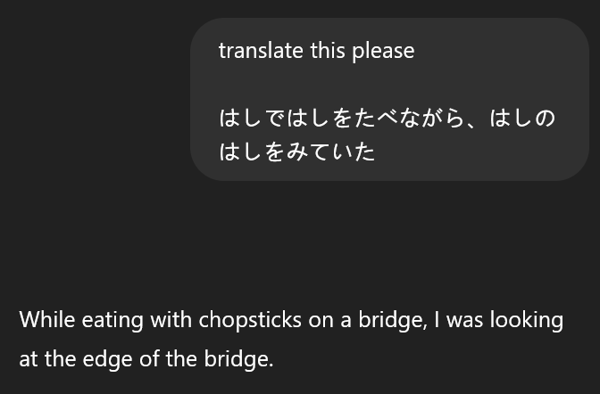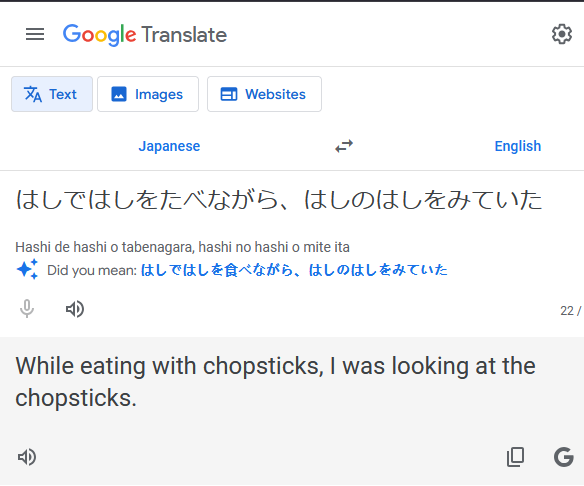 These challenges even effect popular tools like Google Translate. The below example uses the word “hashi” 4 times.